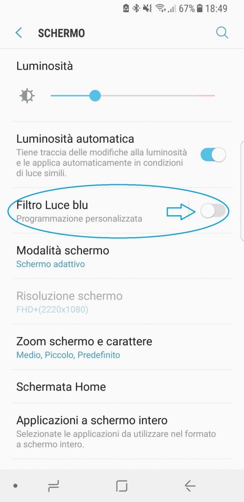 In questo caso la procedura per attivare il vostro filtro sarà: cliccare su “Impostazioni”, selezionare la voce “Display” e attivare la “Modalità Notturna” o “Filtro Luce Blu” e il gioco sarà fatto.