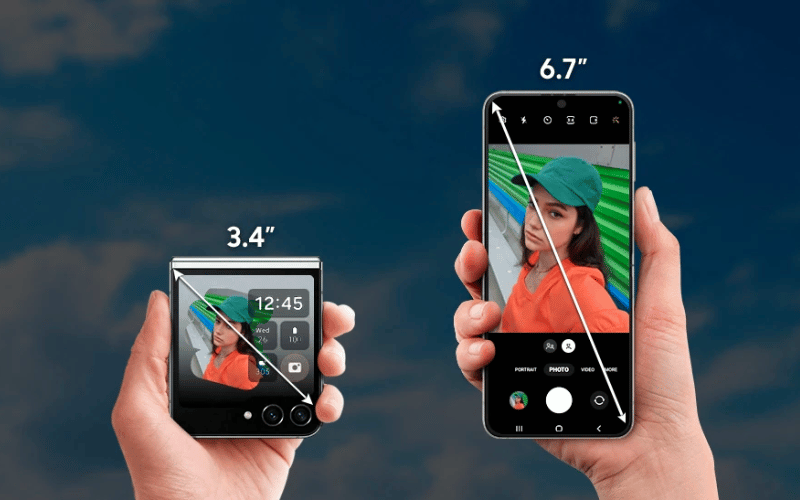Rispetto al modello più grande, Galaxy Z Flip 5 dovrebbe subire maggiori mutamenti estetici: in primis, il display esterno coprirà uno spazio più ampio, diventando più accessibile e versatile nel suo utilizzo. Infatti lo schermo AMOLED conterà probabilmente 3,4 pollici, con risoluzione HD. Internamente invece si prevede un classico display da 6,7 pollici, sempre AMOLED, con tecnologia Full HD+ e refresh rate fino a 120 Hz.